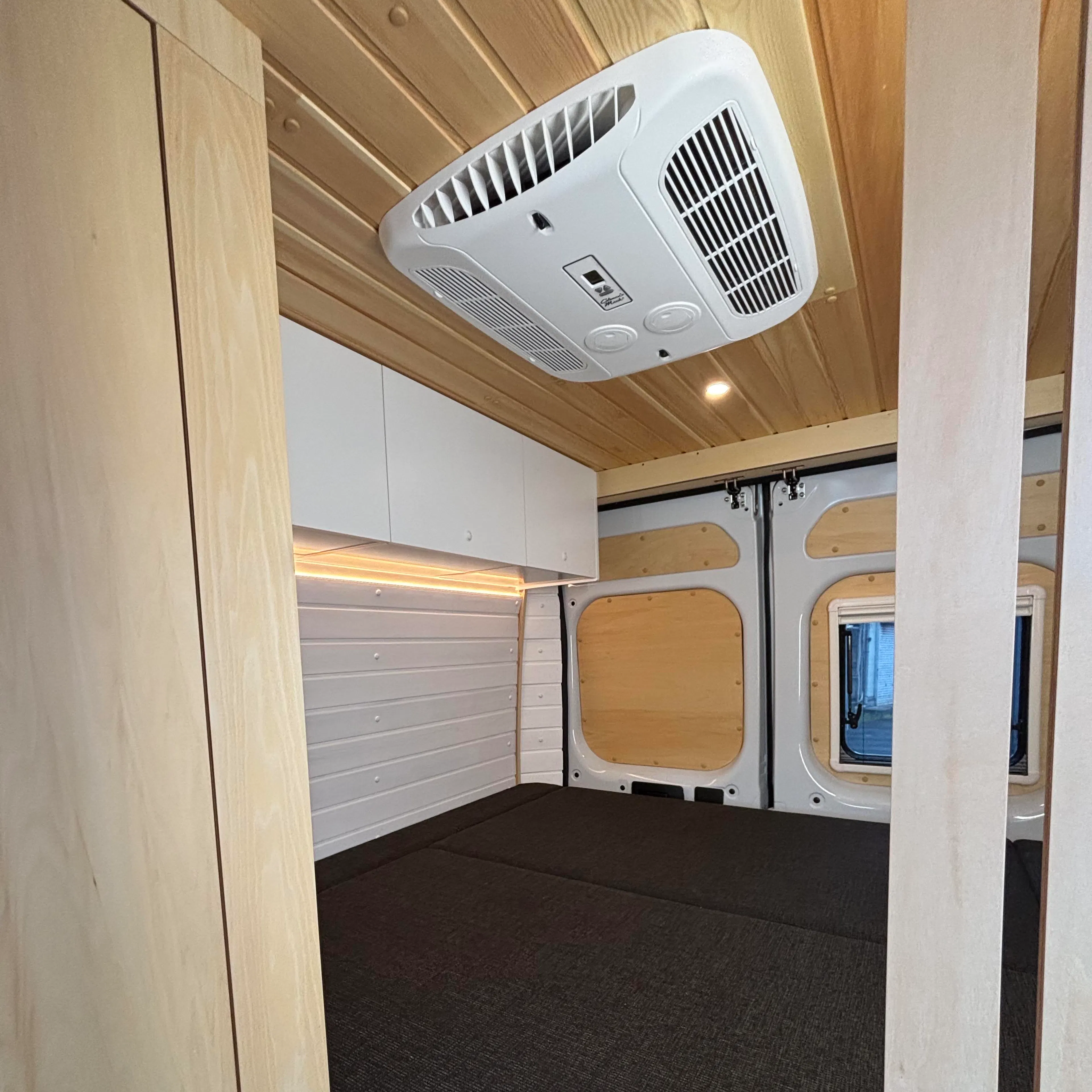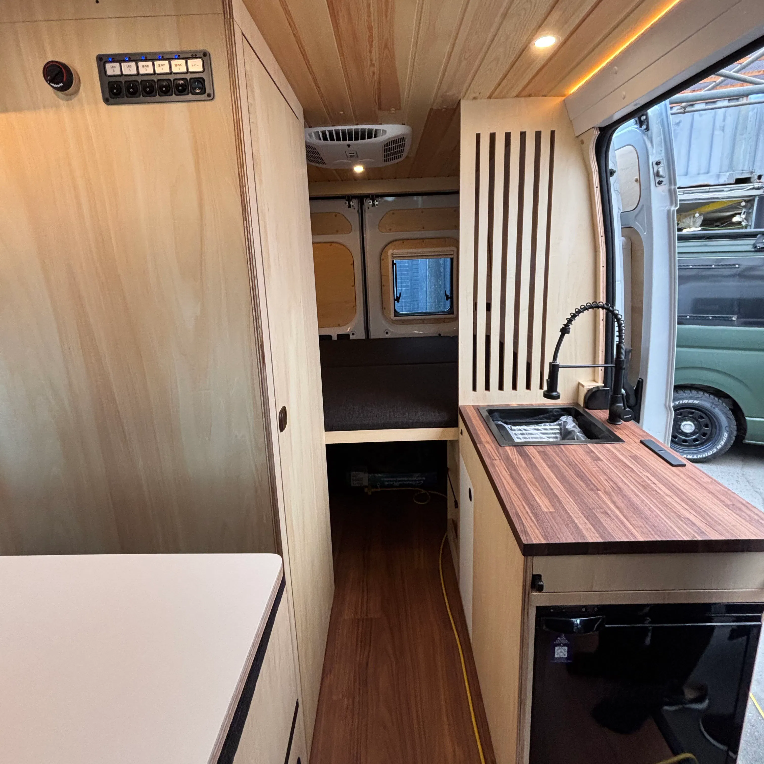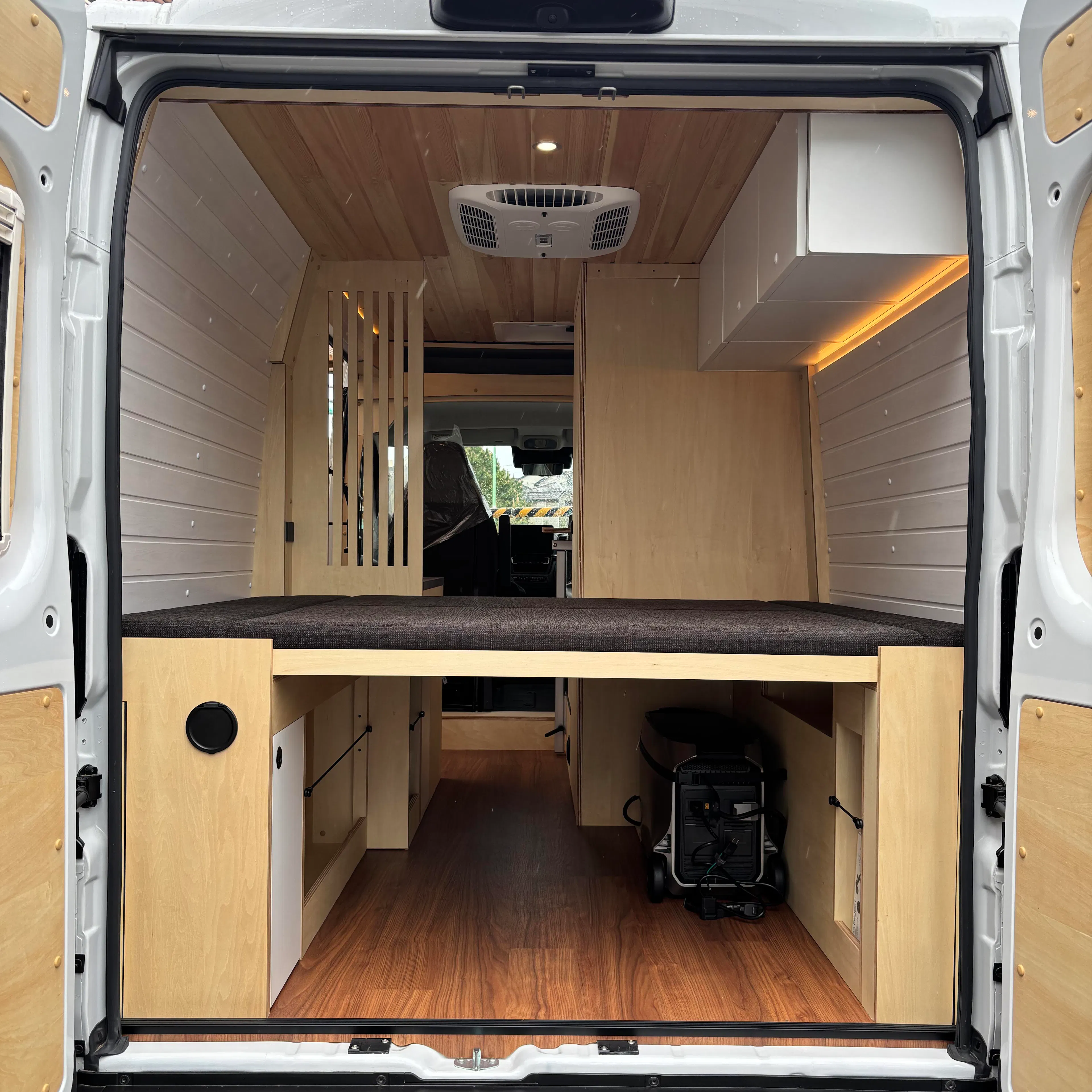 120V仕様の高出力クーラーを搭載し、季節を問わず快適な車内環境を維持。間接照明やダウンライトによる空間演出と、複数箇所の電源配置により、機能性と居心地の良さを両立しています。