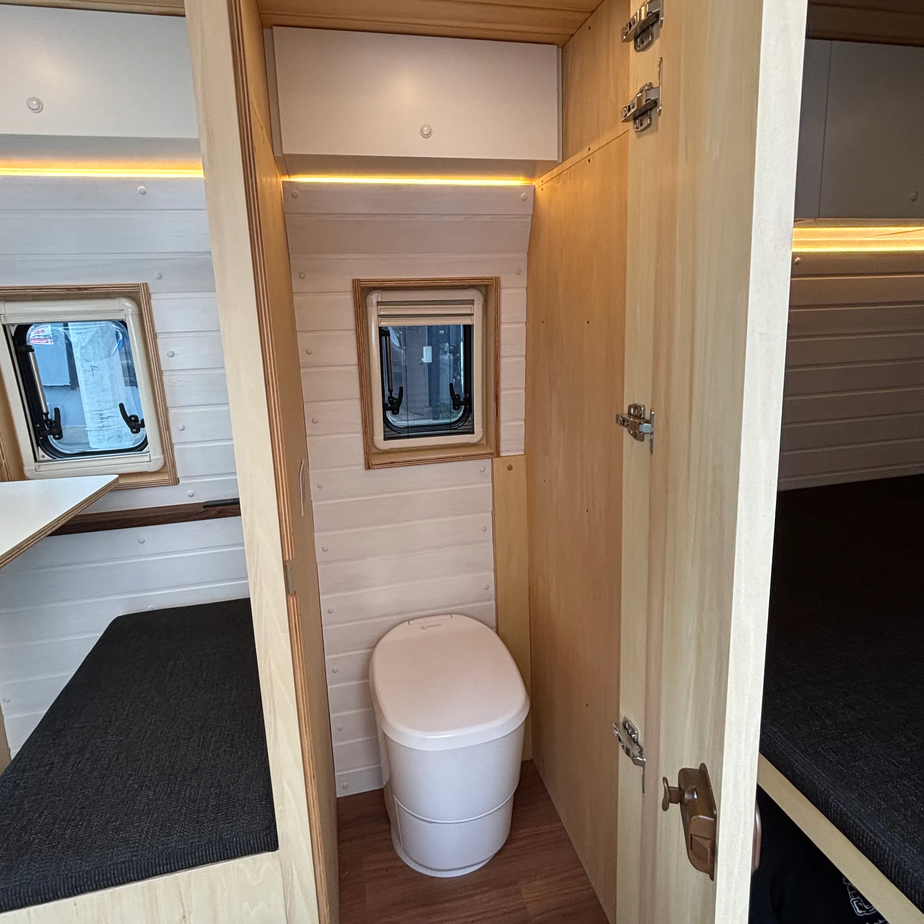 限られたスペースの中でも実用性を重視したトイレ空間を確保。換気窓や収納を備えることで、日常的に安心して使える仕様となっています。深夜の車中泊や長期旅行でも安心です。