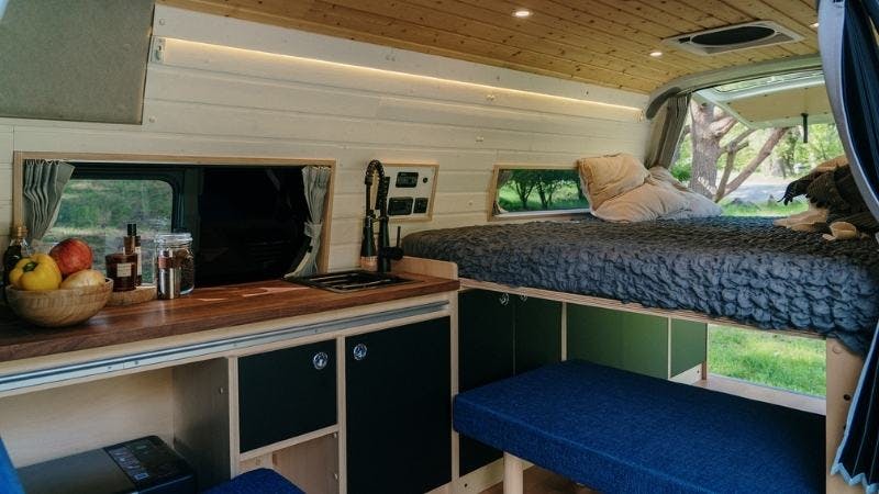 トヨタハイエースをベースに、無垢材の家具を使ったおしゃれなデザインで、様々なライフスタイルに対応します。家族やペットとの旅行、外出先での仕事、趣味のアウトドアなど多目的に使える車両です。
