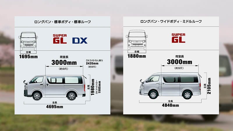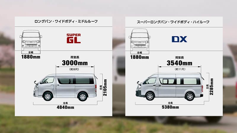 全幅1,880mmのワイドボディは「ロング・ワイドボディ・ミドルルーフ」、「スーパーロング・ワイドボディ・ハイルーフ」が設定されています。