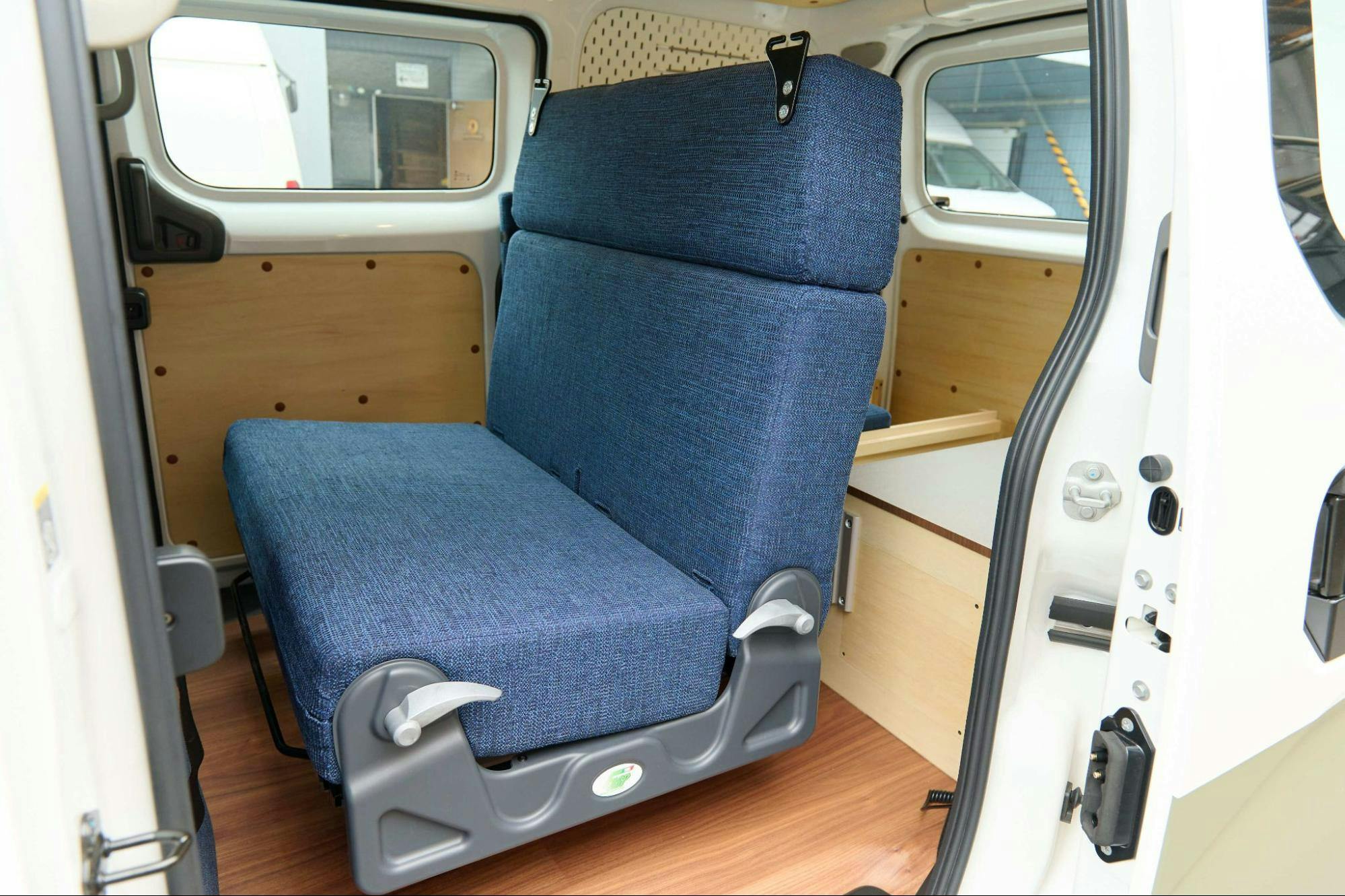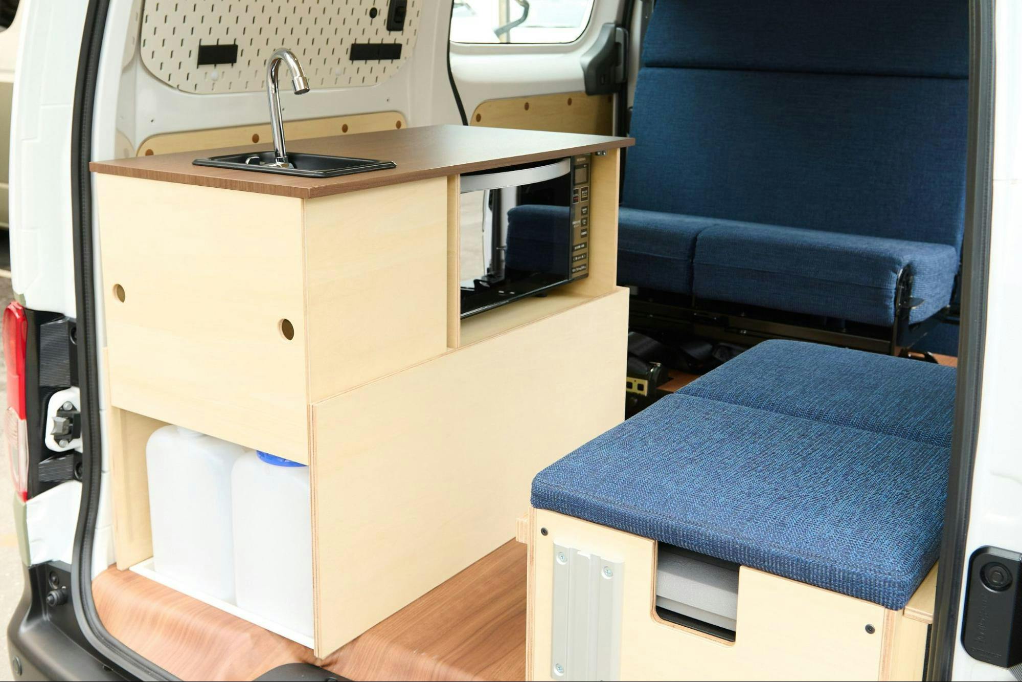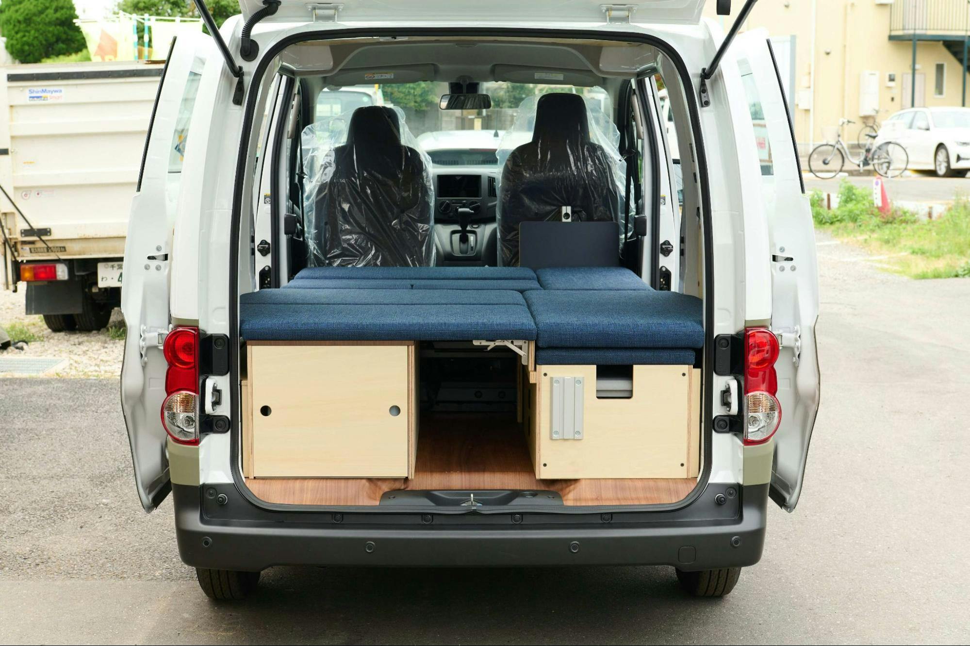 扱いやすいコンパクトバンをベースに、昇降式キッチンや可変ベッド、木の温もりを感じる内装などを備え、日常使いはもちろん、旅先でも快適に過ごせる工夫が詰まっています。この仕様を日産NV200またはトヨタ・タウンエースをベースに製作することが可能です。