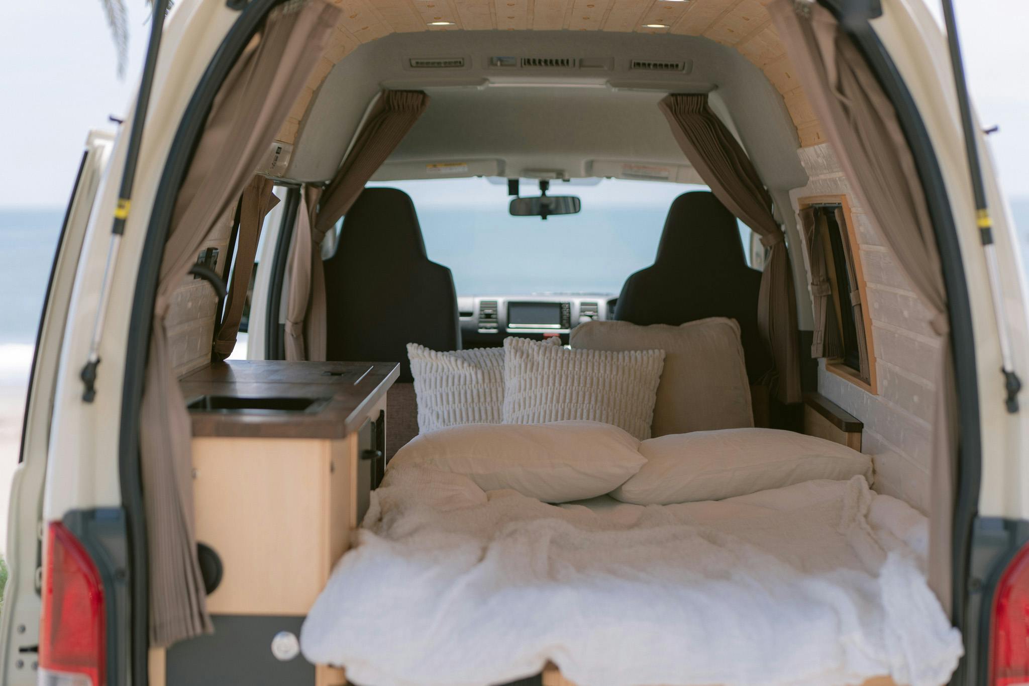 リアベッドタイプは、車両後部に常設のベッドを配置した仕様で、いつでもすぐに就寝できる利便性があります。ベッドサイズは1,800mm~2,000mm程度が一般的で、大人2名が快適に就寝できます。