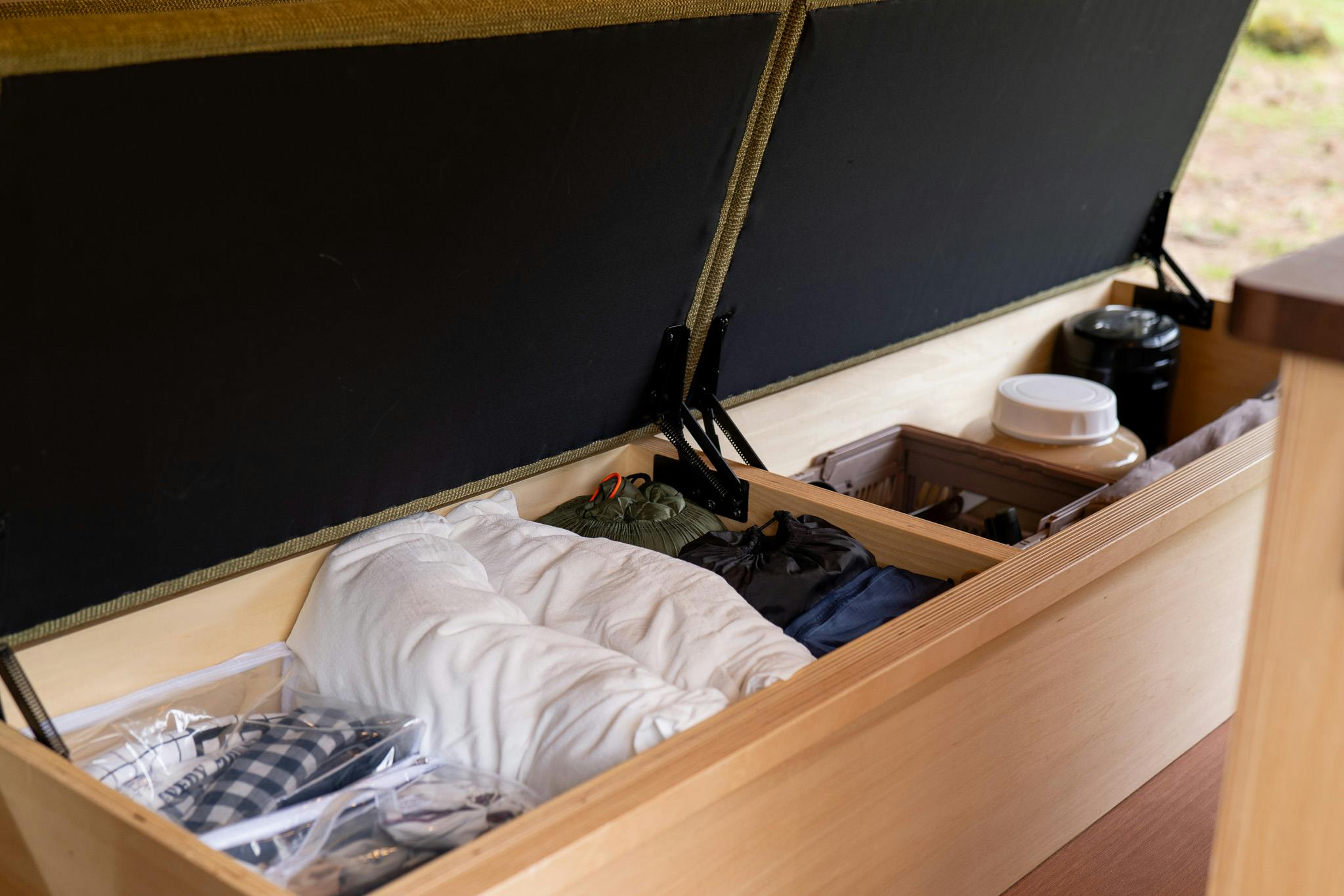 ハイエースの広い室内空間を活かし、効率的な収納スペースが設計されています。シンプルな仕様では、ベッド下やシート下を収納に活用し、必要最小限の荷物を収納できます。